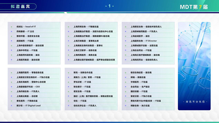 在新的市場契機下,由勤哲文化主辦的MDT 2023第七屆中國醫藥健康數字科技大會應勢而來。本次大會以“2023:加速構建數據驅動的智慧企業”為主題,將于2023年3月30-31日在上海隆重舉行,現場匯集350+醫藥健康行業知名企業高管、CIO、 IT負責人以及行業優秀信息化服務商。從業界最佳實踐、技術發展趨勢、轉型價值發現、頭部企業案例出發,多方面探討制醫藥健康企業該如何通過數字化轉型充分賦能自身成長;如何結合自身優勢,進行數字化戰略布局。