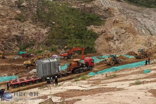 南方電網(wǎng)深圳供電局500千伏坪山輸變電工程施工現(xiàn)場,工作人員利用裝載機輔助牽引運輸主變壓器。