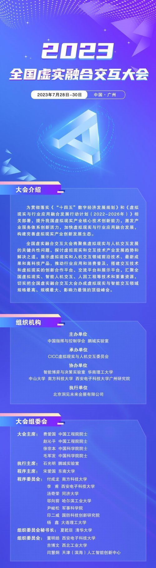 在貫徹實施《十四五”數(shù)字經(jīng)濟發(fā)展規(guī)劃》和《虛擬現(xiàn)實與行業(yè)應(yīng)用融合發(fā)展行動計劃(2022-2026 年)》的背景下,為提升我國虛擬現(xiàn)實產(chǎn)業(yè)核心技術(shù)創(chuàng)新能力,加快虛擬現(xiàn)實與行業(yè)應(yīng)用的融合發(fā)展,構(gòu)建完善虛擬現(xiàn)實產(chǎn)業(yè)創(chuàng)新發(fā)展生態(tài),由四位知名院士共同擔任大會主席的全國虛實融合交互大會將于 7 月 28 日-30 日在廣州舉行。