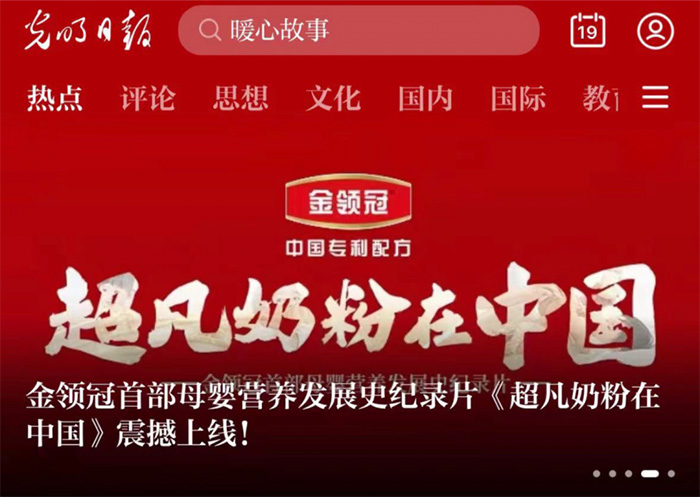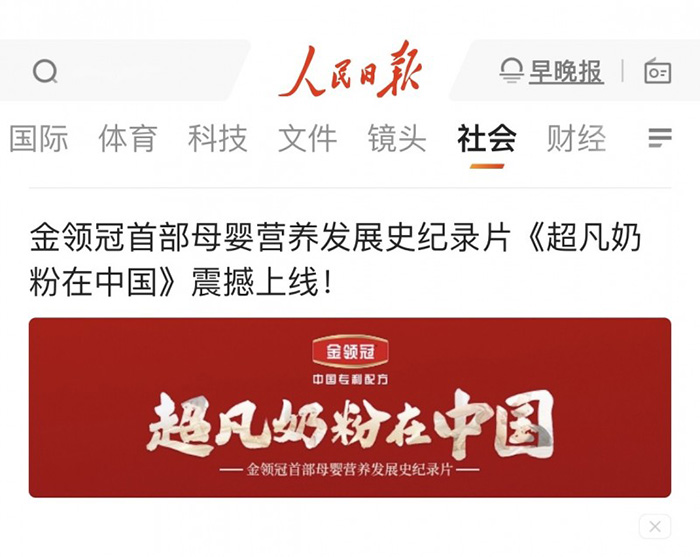 9月19日,人民日報就金領冠《超凡奶粉在中國》紀錄片以專欄形式進行全面報道,人民日報指出:金領冠作為中國嬰幼兒配方奶粉領軍品牌,展示出了中國龍頭品牌的責任擔當。中國專利配方[1]給無數中國家庭提供了營養解決方案,讓國產奶粉成為更多中國媽媽的首選。