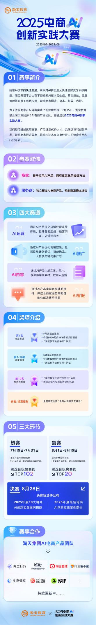 7月15日,淘寶教育正式啟動「2025電商AI創新實踐大賽」,旨在發掘和推廣AI電商最佳實踐案例,幫助商家抓住AI重塑經營的時代紅利。