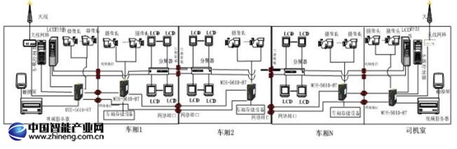 車載PIS系統主要由列車移動寬帶收發設備、視頻播放和視頻監控系統三部分組成,其中視頻播放和視頻接收共用車載局域網。PIS車載子系統由車載控制器、無線網橋、車載天線、LCD播放控制器、車載交換機、電源適配器、分屏器、LCD顯示屏、車廂網絡交換機、車載視頻服務器、網絡攝像頭、觸控顯示屏、車廂視頻存儲設備等組成。