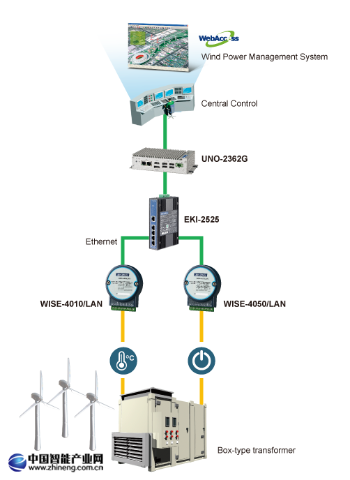 通過嵌入式無風扇工業電腦UNO-2362G、非網管型工業以太網交換機EKI-2525以及兩款物聯網以太網I/O模塊WISE-4010/LAN與WISE-4050/LAN,研華解決方案即能將現場各種裝置的信號與數據上傳至中心監控室內的風場監控系統。其中,可支持Windows CE、Windows XPE、Embedded Linux等多種開放式操作系統的UNO-2362G能以更好的兼容性來取代原有的RTU;而提供高速以太網絡傳輸的EKI-2525所形成的局域網絡(LAN)則負責串連現場所有的硬件裝置,并藉此讓風力發電機成為可被監控的聯網設備。