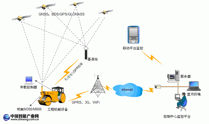 使用北斗等GNSS多星系統(tǒng)聯(lián)合高精度定位,可以把衛(wèi)星定位的三維坐標實時的輸入機載計算機,自動生成三維數(shù)字模型,機載計算機實時比較工程機械作業(yè)端的當前位置和設(shè)計數(shù)據(jù),并輸出校正控制信號及控制設(shè)備,對機械的作業(yè)端進行控制,主要施工機械只需要1-2次往返施工,即可達到設(shè)計位置,這種以絕對坐標X、Y、Z為基準的全新控制方式,摒棄了測量、打樁、放樣等傳統(tǒng)工序,一次性解決高程控制、平整度控制、坡度控制等等問題,節(jié)省了大量的現(xiàn)場測量工作,把工程機械操作手從繁重的整平工作中解放出來,使他可以專注于駕駛,大量提高了施工現(xiàn)場的工作效率及安全性,同時也可以將數(shù)據(jù)傳遞到控制中心進行質(zhì)量控制。系統(tǒng)組成示意圖如下:
