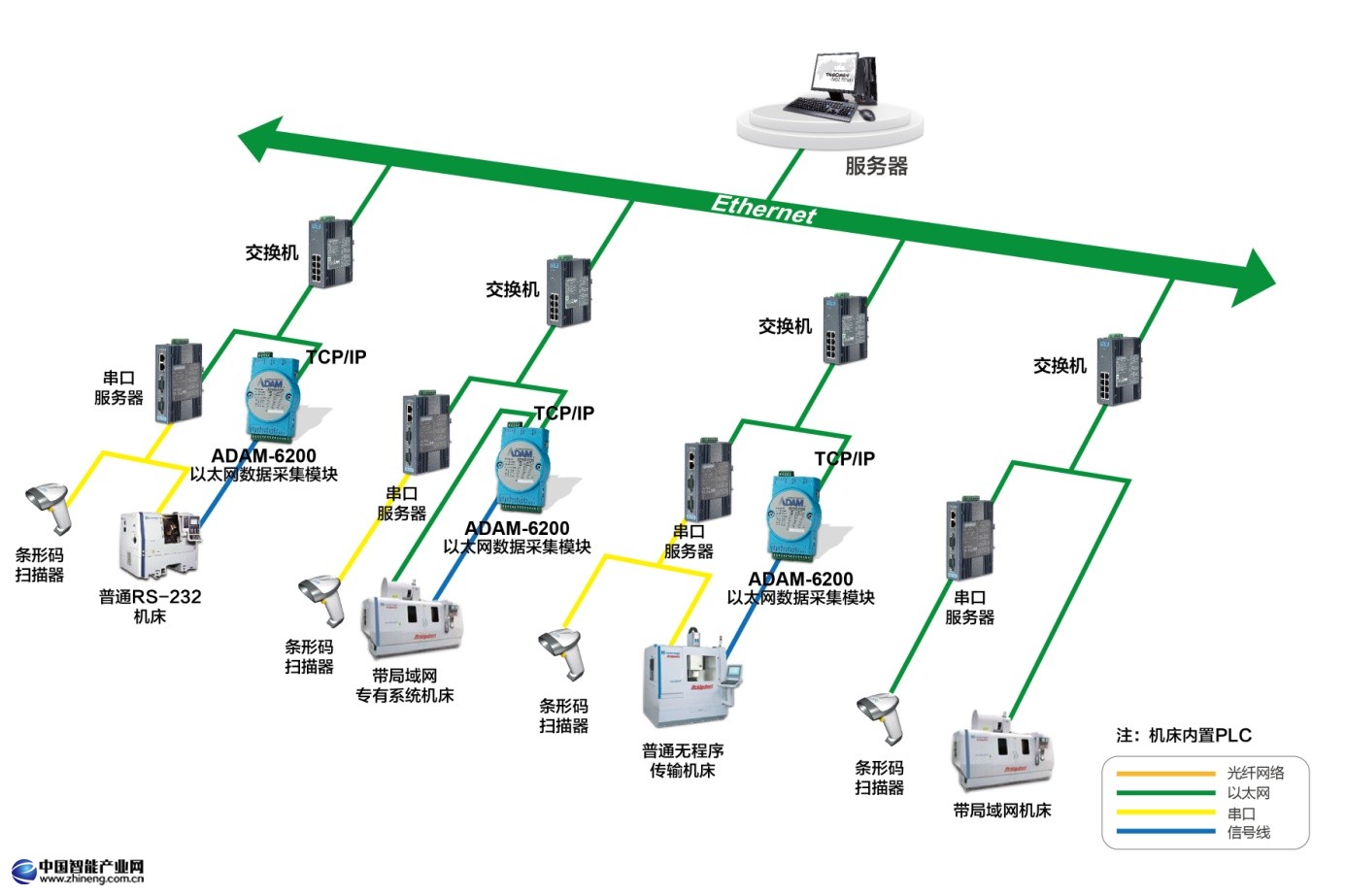 車間機床的設備,種類繁多,根據智能程度劃分,分為:帶局域網機床、普通RS232連接有宏B功能的機床、帶局域網專用系統機床、普通無程序傳輸的機床、普通RS232連接無宏B功能的機床。前兩種不用添加任何硬件采集模塊,可以直接通過網卡可以采集幾乎所有的信息。后三種機床設備需要增加硬件以太網采集模塊ADAM-6200,采集到機床的實時工作狀態信息。 ADAM-6250 :8 DI\7DO;機床的實時狀態采集,機床是開機中還是關機;機床的工作狀態采集,如運行狀態、空閑、故障等;(該應用只用到DI) ADAM-6217:8AI 主軸功率;轉速和進給,可以實時反饋當前的轉速S值和進給速度F值,機床倍率;溫度、壓力等。 此外,如果您現場不方便布線,研華還提供無線IO采集方案,ADAM-2000系列產品基于IEEE802.15.4/ZIGBEE技術,2.4G全球免費頻段,具有可靠、高性價比、低功耗、彈性網絡覆蓋等特點,可以與研華ADAM-4000、ADAM-6000等產品集成,提供卓越的工全面智能工廠解決方案。