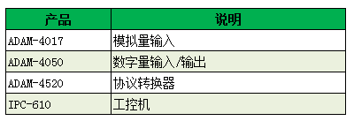 整個系統用了3個ADAM-4017數據采集模塊,分別用來采集三個農業大棚的溫度、濕度和二氧化碳的濃度的數據, 3個4050分別用來控制三個農業大棚的電動閥門以及采集按鈕開關的狀態。詳細硬件清單如表1: