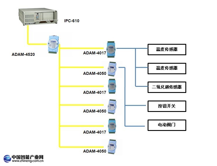 根據以上的要求,我們使用了如下的配置方案:采集和控制的模塊使用研華公司的ADAM-4017和ADAM-4050;控制邏輯由一臺研華IPC610上位機完成,使用組態王上位組態軟件編制控制程序。