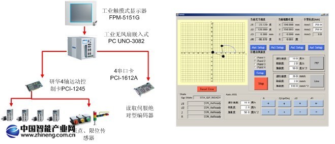 該四軸SCARA機械手控制系統采用研華高性能嵌入式工業PC UNO-3082為核心控制單元,以15”工業觸摸式顯示器為顯示操作單元,系統搭載研華先進的基于DSP的四軸運動控制卡用于控制四軸伺服電機,用4串口卡PCI-1612A用于讀取伺服絕對值編碼器數值。同時系統支持Windows XP embended, Window XP, Windows 7等操作系統。由于采用的是開放性、通用性平臺,及系統強大的運算和信息處理能力,豐富的硬件資源,使得整合視覺、圖形、運動控制變得十分容易。系統支持的簡潔的基于G-CODE的編程語言平臺,使得用戶可簡單的進行二次集成來適應不同的產線控制需求,實現自動化控制目的,同時降低人力成本,提高控制效率及大幅度降低產品次品率。