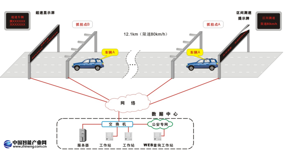傳統超速抓拍系統采用的是單點測速方式,測量的是車輛的瞬時速度,容易引起爭議、容易躲避。區間測速是在高速公路、隧道、國省道無交叉路口的某一區間(一般為20公里左右)的兩端安裝自動抓拍卡口系統,記錄車輛通過兩端的時間,利用“速度=距離/時間”公式,計算出車輛在該區間內的平均車速。為達到滿意的效果,抓拍系統應具有很高的車輛捕獲率和識別正確率。區間測速讓駕駛員難以回避,作為處罰超速違法行為的法律依據將更有說服力。