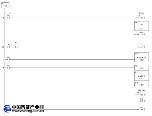 程序控制分為兩部分,CPU內的主程序為傳統的PLC梯形圖程序,該程序采用光洋的級式語言編程,依據工藝流程圖編寫,結構明晰、調試方便;U-01SP內下載伺服控制程序,整個磨削過程及砂輪修正程序均包含在G代碼伺服程序內。當PLC主程序需要調用伺服程序時,只需要控制U-01SP的對應輸出繼電器即可。如啟動自動運行,只需將Qn+02輸出為ON;如啟動手動反轉,將Qn+03置為ON即可,伺服運行時In+02為ON顯示伺服系統運行中(BUSY)。限于篇幅,詳細的工藝流程圖在此無法展開,這里給出砂輪修正部分的PLC程序示例: