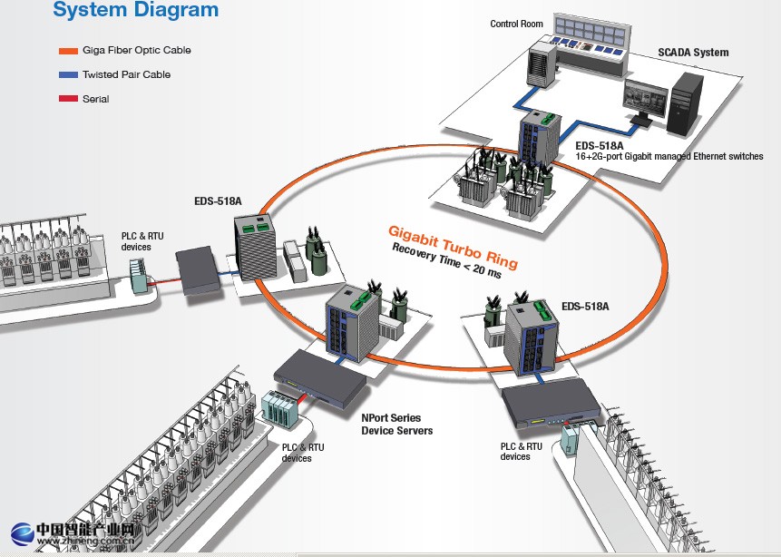 對于一個變電站SCADA系統最重要的是要確保高度的24/7 可用性,來監控從變電站系統和處理過程中傳來的信息。該紡織工廠選擇了強大的Areva 能源輸配(T&D)管理解決方案,同時結合了Moxa 的冗余以太網交換機。這確保了RTU和中央SCADA系統之間可靠有效的通訊。整個環網骨干使用Moxa EDS-518A 千兆網管型以太網交換機,充分利用Moxa專利的 Turbo Ring 自愈技術,恢復時間小于20毫秒。這些網管型以太網交換機擁有一系列功能,很適用于變電站設施穩定,連貫的操作,比如:先進的管理,高級安全性,介質冗余,冗余電源輸入,EMI保護,和工業級強固設計,-40 到 75°C 操作溫度范圍。