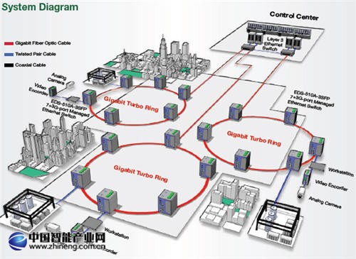 膠州電能集團擁有位于3個不同城市的30個變電站。 為了更可靠地進行配電監控,膠州電能集團為他們的能量控制系統部署了一個以太網環形拓撲結構。 基于這30個變電站所處的位置,使用 Moxa 公司的 EDS-510A-3SFP Gigabit 網管型以太網交換機建造了3個環形以太網。 這些環形以太網使用 Moxa 公司的 Turbo Ring 專利技術作為備用系統。 配電系統的保護繼電器直接連接到 EDS-510A-3SFP 交換機上,共同組成一個受 Moxa 公司 Turbo Ring 協議保護的環形拓撲,從而保證在網絡故障時實現毫秒級的恢復。 此外,每一個 EDS-510A-3SFP 交換機都連到一個用于視頻監控的工作站,從而為系統維護人員在現場進行監測操作提供了一個有效的途徑。 EDS-510A 交換機配備有三個 Gigabit 以太網端口以提供高帶寬的解決方案,不僅為冗余 Gigabit Turbo Ring 骨干提供能量,也留下一個空的 Gigabit 端口用于向上連接到核心交換機上。