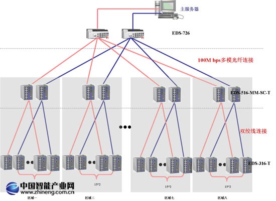奧 運(yùn)場(chǎng)館水立方藝術(shù)燈光景觀項(xiàng)目的網(wǎng)絡(luò)架構(gòu)圖所示:網(wǎng)絡(luò)采用雙網(wǎng)架構(gòu),分為三層。設(shè)備層由188臺(tái)EDS-316-T交換機(jī)組成,主要負(fù)責(zé)連接現(xiàn)場(chǎng)的LED 燈光控制器,控制景觀燈的開關(guān)和顏色。匯聚層由16臺(tái)EDS-516A-MM-SC組成,負(fù)責(zé)連接現(xiàn)場(chǎng)層的EDS-316-T。核心層使用兩臺(tái)EDS- 726模塊化交換機(jī)組成,負(fù)責(zé)連接匯聚層的EDS-516A-MM-SC和服務(wù)器。