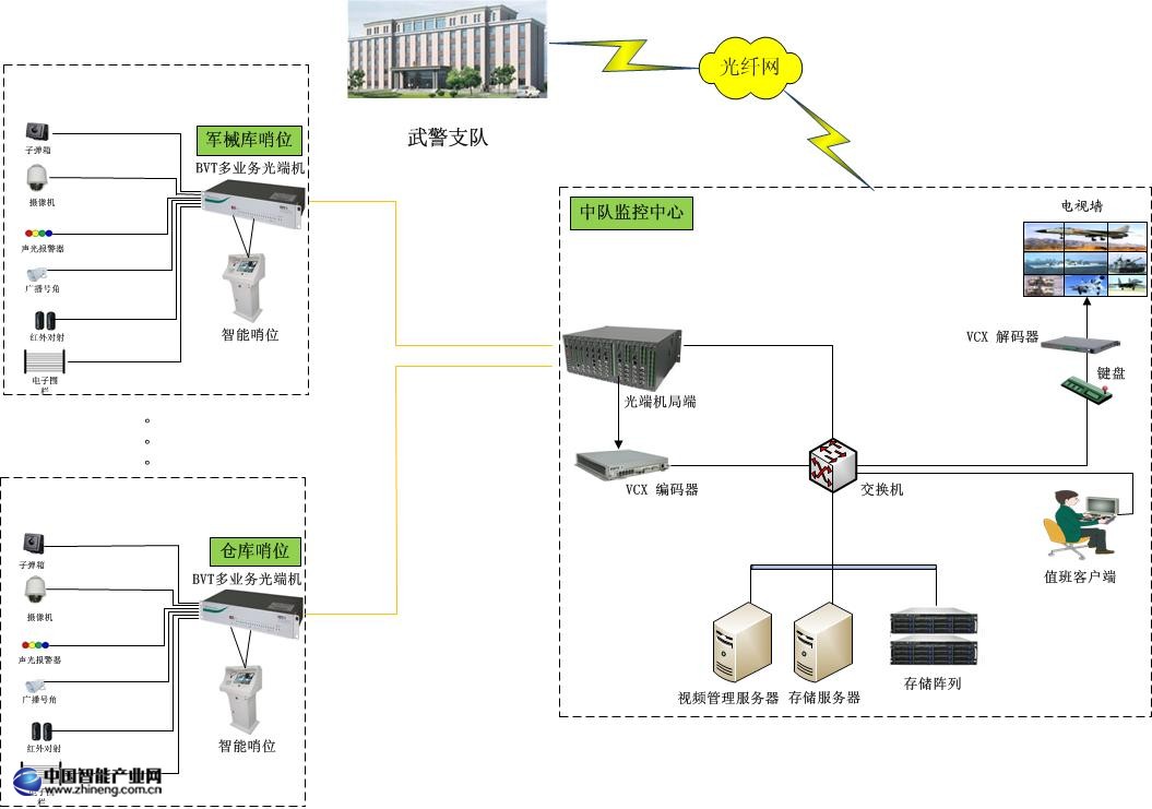 系統遵循技術先進,性能穩定,經濟實用的原則。對執勤崗哨(如武警中隊崗哨、倉庫大門崗哨、軍械庫崗樓崗哨),重點部位(如軍械庫大門、庫區)等區域進行監控。提高武警中隊自身的安全防范能力,以及武警總隊對下屬單位的監控管理能力。