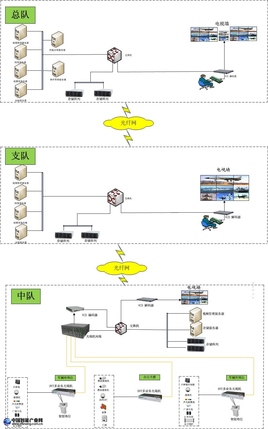武警中隊本地值班監控室、武警支隊監控中心和武警總隊指揮中心均需監控現場情況,共享視頻、數據、網絡資源,形成一個強大的武警三級視頻監控系統。
