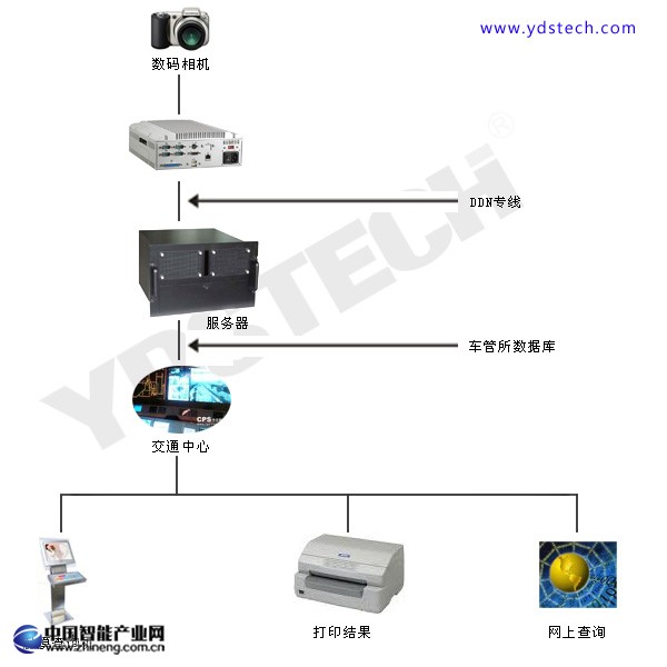拍照前端采用的是地感線圈的檢測方式,根據磁通量變化原理,由嵌入在路口的工控機來進行相機快門的控制和對閃光燈進行控制,數碼相機拍得的違章照片將首先被存儲在相機的SM卡(Smart Media card) ----智能存儲卡中。當卡內的照片達到一定數量的時候,相機將自動將照片下載到路口工控計算機的硬盤內。各個路口的工控計算機通過電話線/ISDN/DDN 專線網或光纜等將照片傳至遠端的監控中心的服務器,然后在由監控中心的計算機工作站來完成對照片的處理及管理。